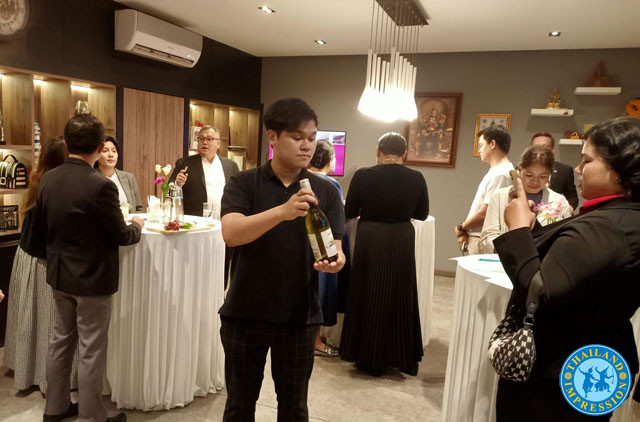 nearly 100 guests stand by in cheer while at welcoming ceremony was delivered by president in briefing over his company then followed by the wine merchant as sole speaker introduced each of 13 items in the characteristics and productive conditions of white and red wines separately as those