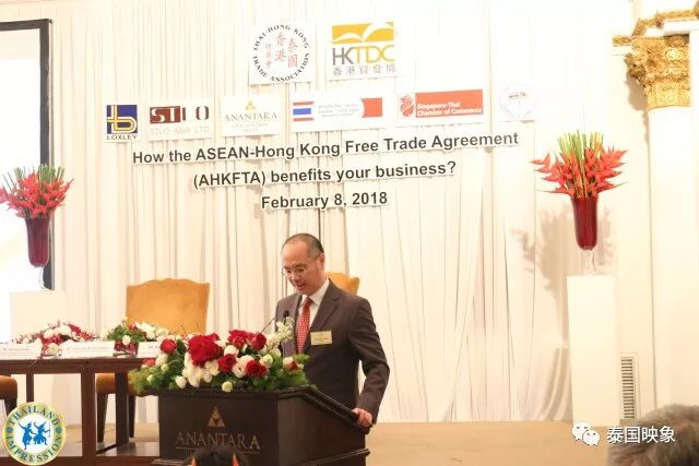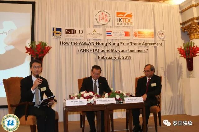 2018年2月8日,泰国香港商会携手泰国贸易发展局召开2018年新年常务会议。特邀泰国商业部世贸谈判司司长抵达现场,就东盟开放香港市场和香港携手签约,共同开放自由贸易市场的签署协定召开记者发布会暨2018年度新春论坛,根据协议章规定在2019年1月1日将东盟市场向香港全面开放,香港和东盟两地的外贸额将大大提升,有力促进两地的民间及物质流通贸易来往。此次发布会由现任泰国香港商会由现任会长Mr.Peter Wong主持,同时邀请香港贸易发展局的东亚、印度司司长就两地贸易领域的谈判及政策条款等事宜和在座的嘉宾交流,东盟香港自由贸易协议于2017年11月12日正式签署,得到泰国各行业的高层及泰国政府的官员等称赞,在现场就座的来宾均是泰国商界的精英,东盟香港自由贸易协定提供了一个坚实的框架,为两地的投资确定一个宽松的环境和稳定的基础,彼此携手打造一个新的广阔经济合作领域。
