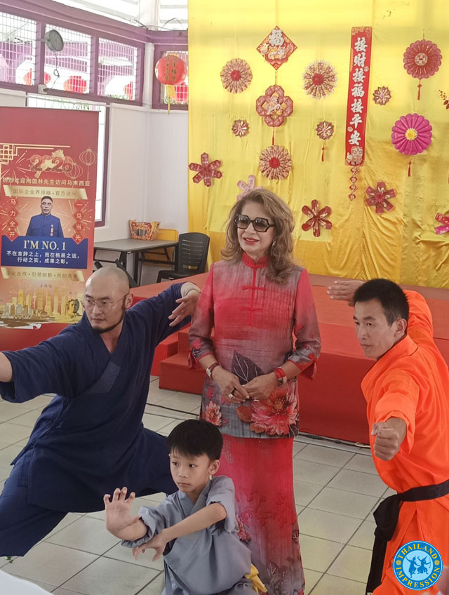 活动现场还邀请来自中国河南嵩山少林寺里走来的一位武术师带领几位弟子前来道贺,修炼一身真功夫的中国武术师表演绝技,一记利刃锁喉硬功,二指禅俯卧撑,硬武功空手对打,随着九节鞭挥舞得劈里啪啦,仿佛喜炮高声响彻整个大厅,顿时赢得满堂喝彩,同时由马国第一个女舞狮高手转为第一位马国舞狮界教头的陈教练率领麾下小弟子,流星踏步,翻腾狮头,畅快淋漓,狮子欢悦,活龙活现,腾越新升,凯歌大气,赢得台下皇后等一行人的亲自瞩目,随着醒狮开道,随从相随,皇后向每一在座的老人颁授新春贺岁金,预祝年年有今朝,喜气随身来,也将马年新春贺岁喜气推向高潮。