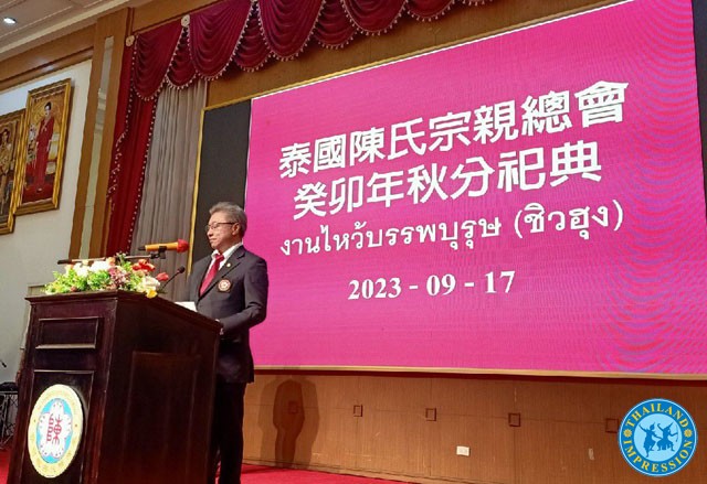 中国老祖宗的智慧将人類与自然的戰鬥生存看作震天動地的開闢史,可謂是天人合一的進化史。2023年9月17日,泰国陳氏宗親總會会举行秋季祭祖活动拉開序幕,一處演繹传承中華傳統風俗,感恩蒼天大地,秋收兆豐年,谢恩列祖列先的護佑,皇恩浩蕩的慈恩得以讓陳氏宗親子孫繁衍生息。今日由现任理事长陈运金統領,众人紅綢馬褂,恪守祖訓,鸣谢礼炮、鞭炮齊響,貢猪香臺,燭火飄蕩整个会场。膜拜大典呈现出一派吉祥图腾的景象,流淌千年文化印記,牢記華夏子孫血脈。伴随着传统的潮州曲牌奏起,喜庆音樂大典拉開序幕,大德先賢的善德善行行映造後人的福蔭,隨著三個小時的膜拜大典走續,司號官宣告典禮落幕,中午一场盛宴可謂告慰各位乡亲父老,陳理事長的一番感言,展望來年的時運到,鴻福天泰,预祝明年的春季祭拜將是一个好的兆头。
