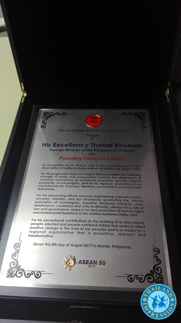 While at celebration of the 50th anniversary of the founding of ASEAN by reviewing over the past years of its glorious history, ASEAN members have been working with hand in hand so closely in fields of educational exchanges, governmental linkages, economic development, tourist cooperation as well as the other aspects, through the thoughts and ideas initiated by Mr.Thanat Khoman who had made Thailand melted into Asean Cooperative Framework which is promoting its members into Unity and Progress, Asian neighbors makes great efforts in pushing ASEAN diplomatic sphere onto outside world, after his death till now his noble deeds have been remembered so long in the hearts of Thais and people all over the world.