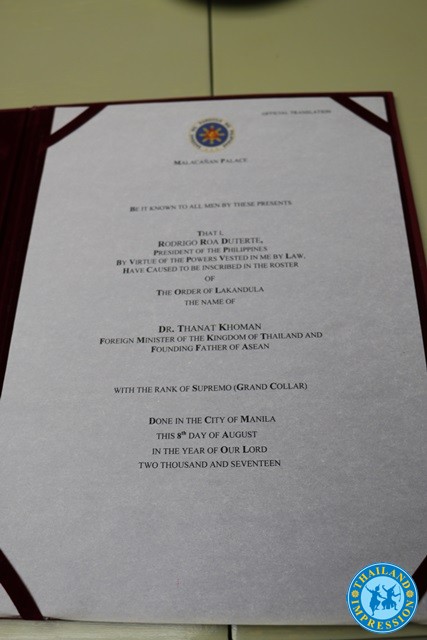 In June 2018, Mr.Amarin Kohman flew to Manila to attend the 50th anniversary of Asean Ceremony, where he received the Supreme Honor of Awards & Blue Medal from President of the Philippines—Mr.Duterte who highly recognized the great achievements in long term made by Mr.Thanat Khoman named as one of the founding fathers to ASEAN.
